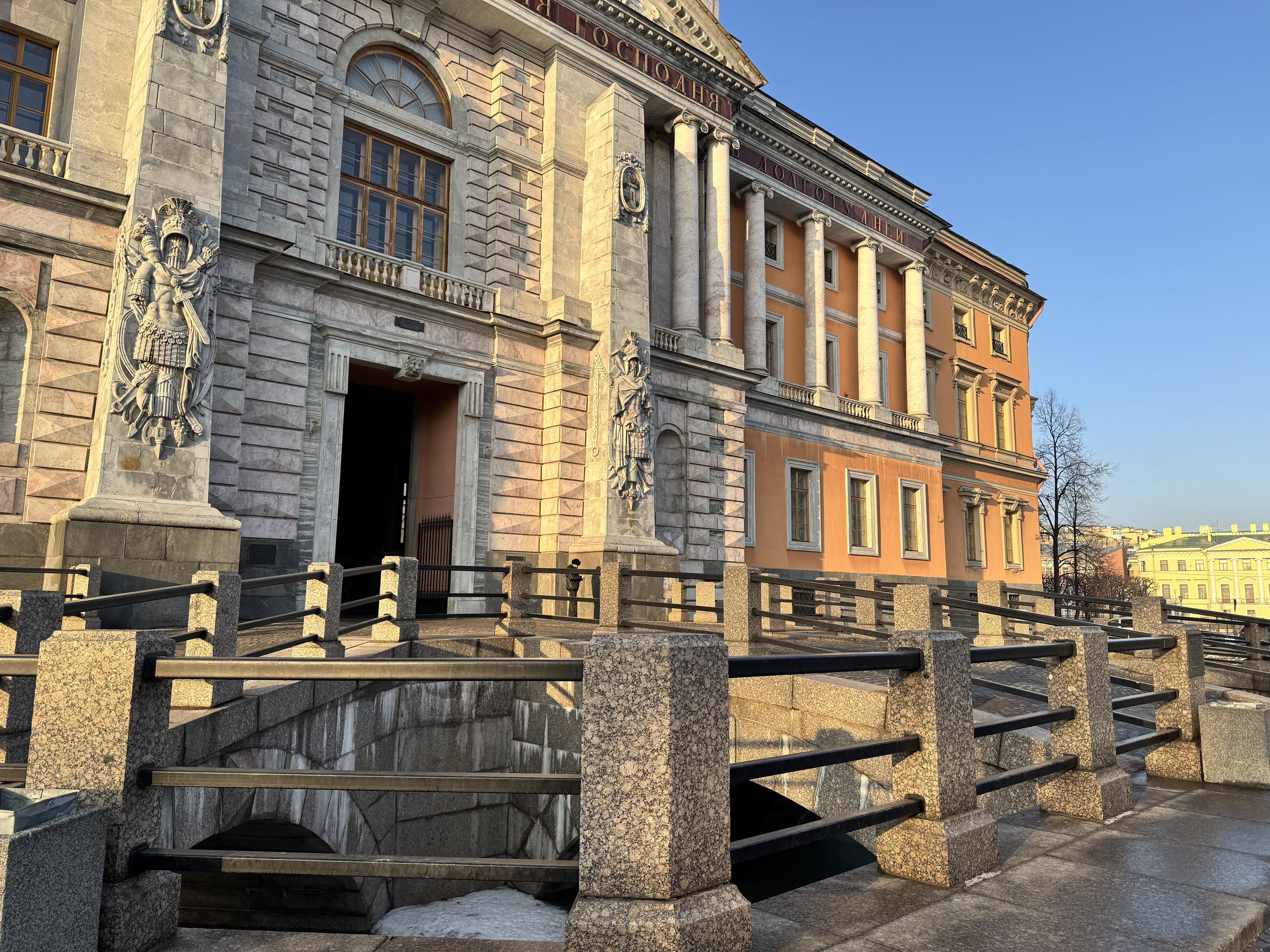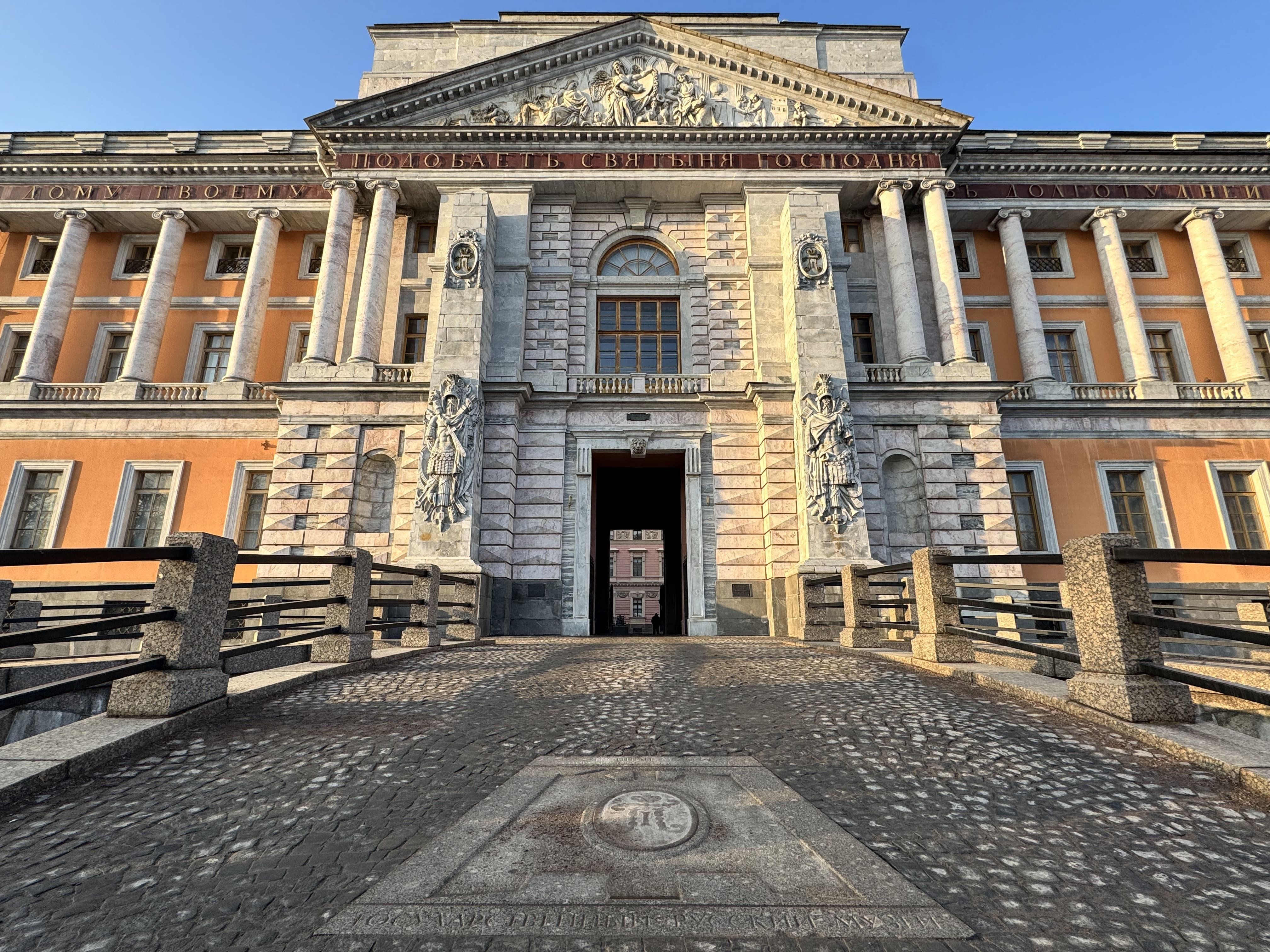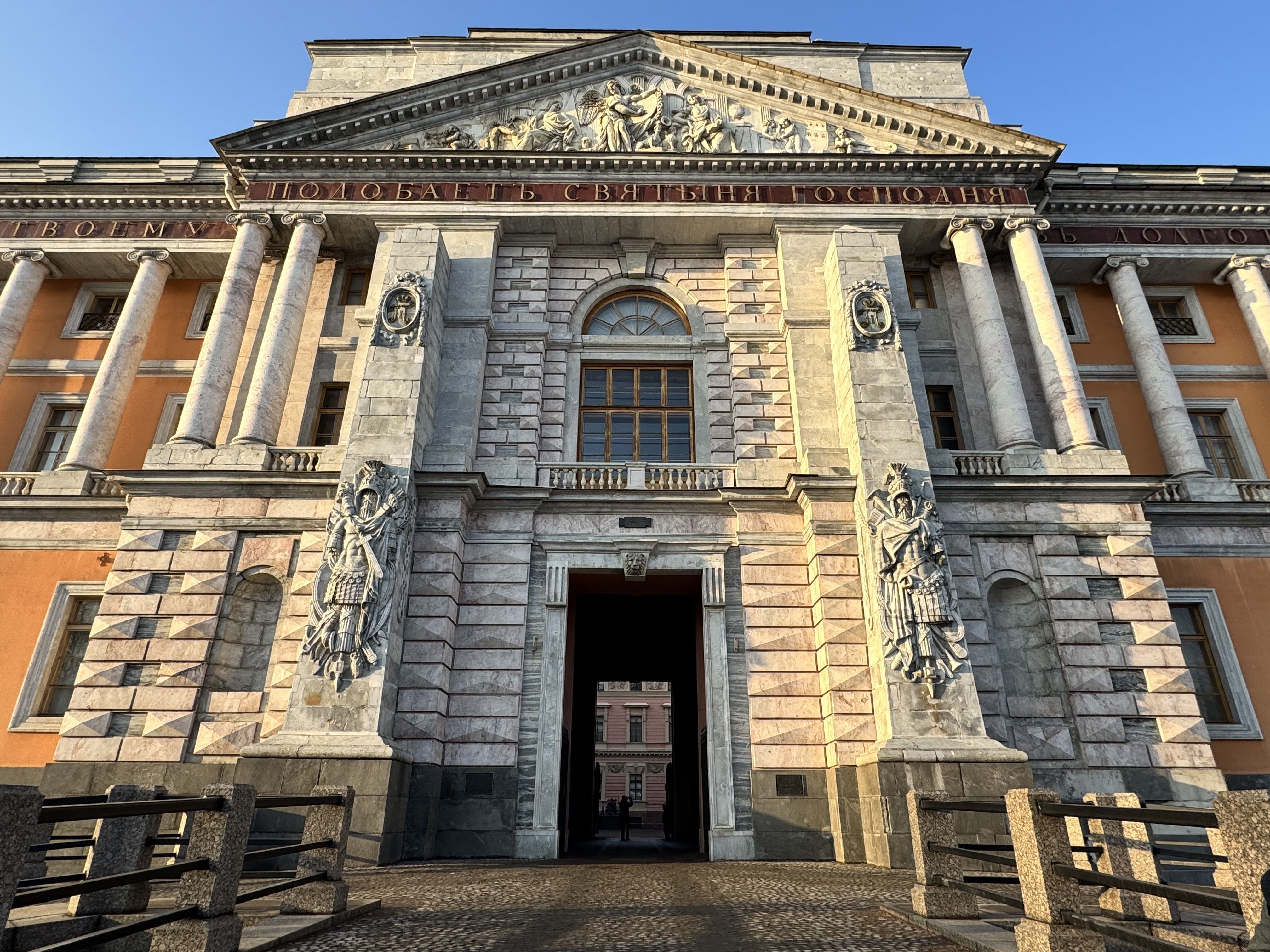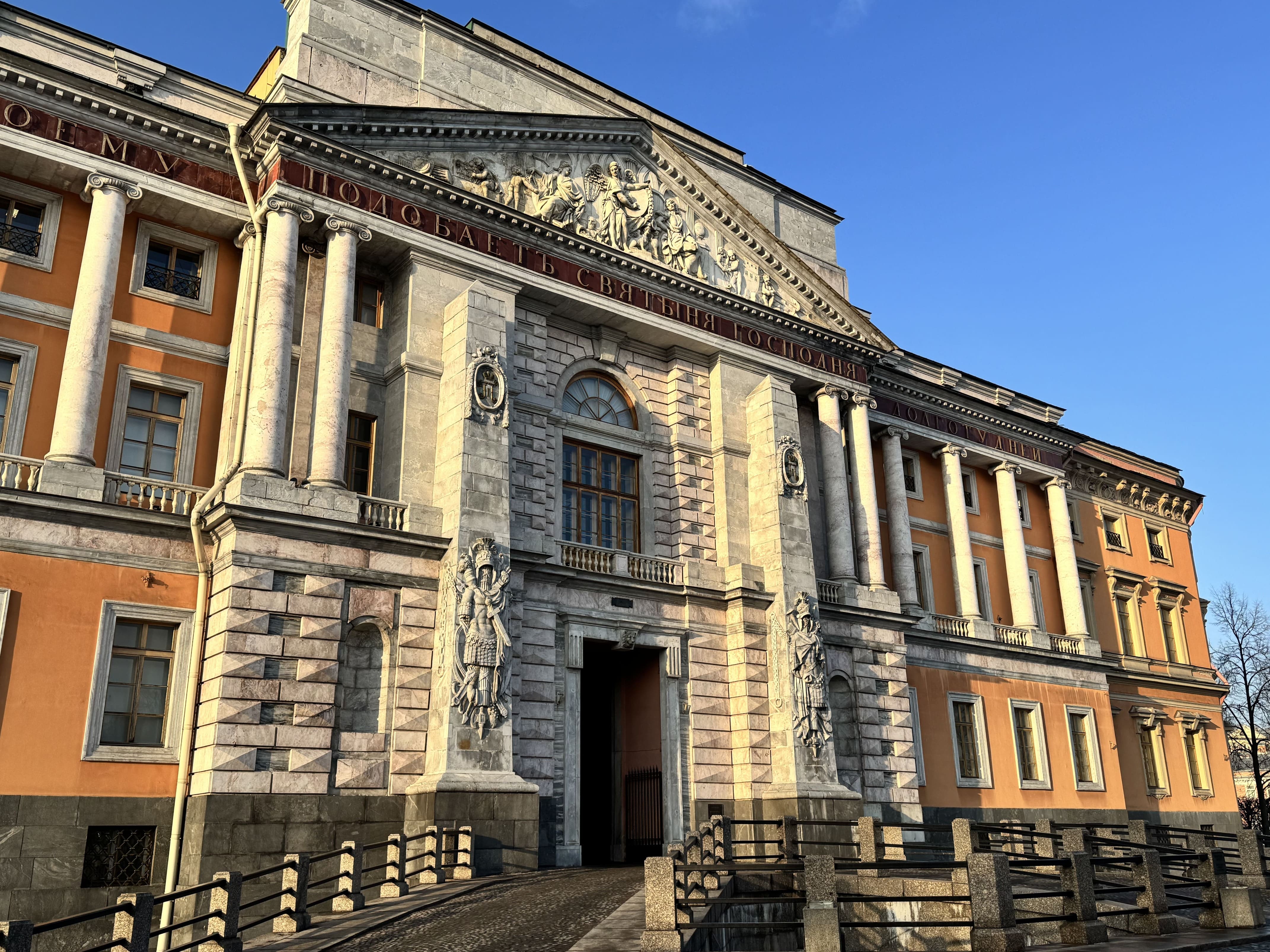 - Цвет фасада — уникален для Петербурга, символизировал военную строгость (Павел I отвергал «дворцовую» белую роскошь).